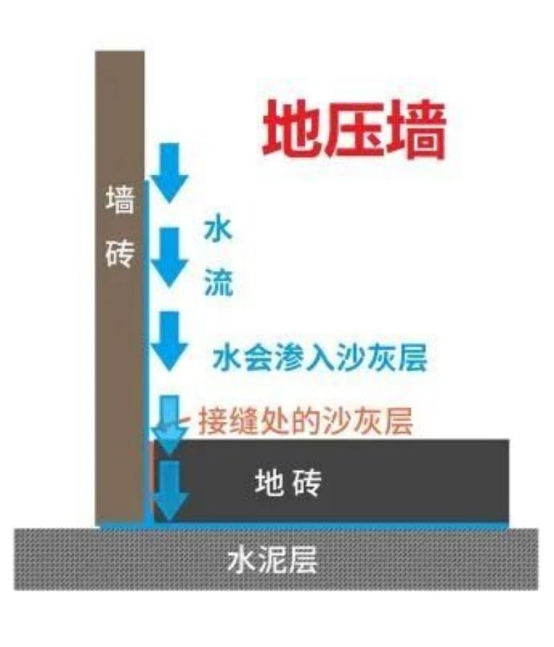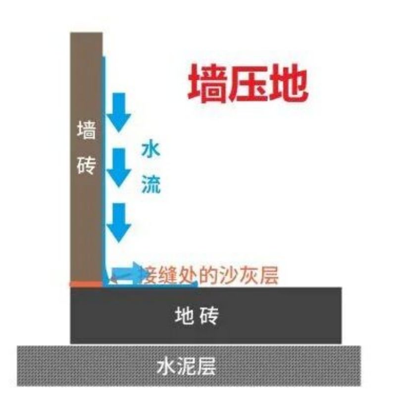 是指地砖的侧面正好对应着墙砖的正面,通常情况下,是先将墙砖铺好,再铺地砖,这样就形成了地压墙的局面。